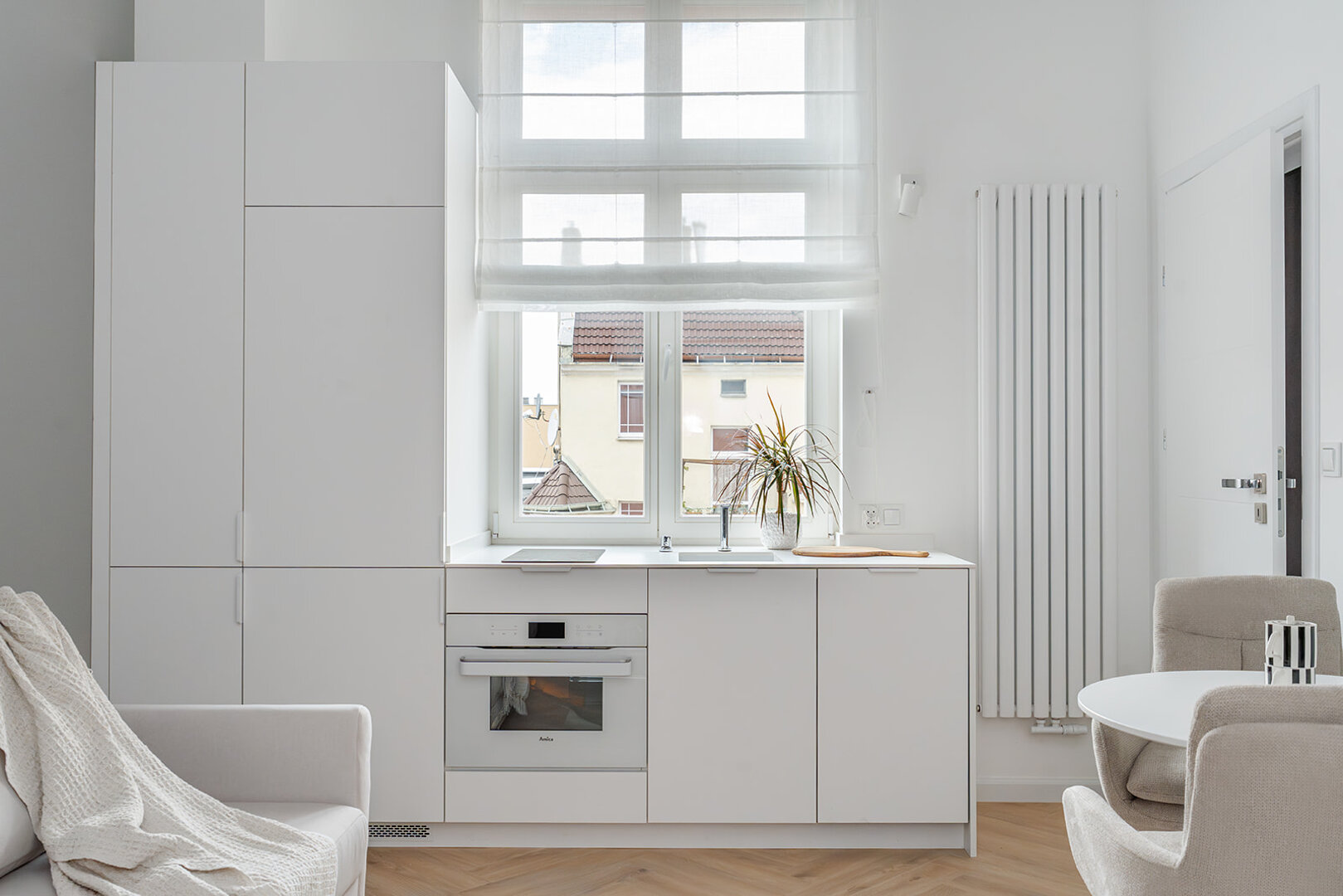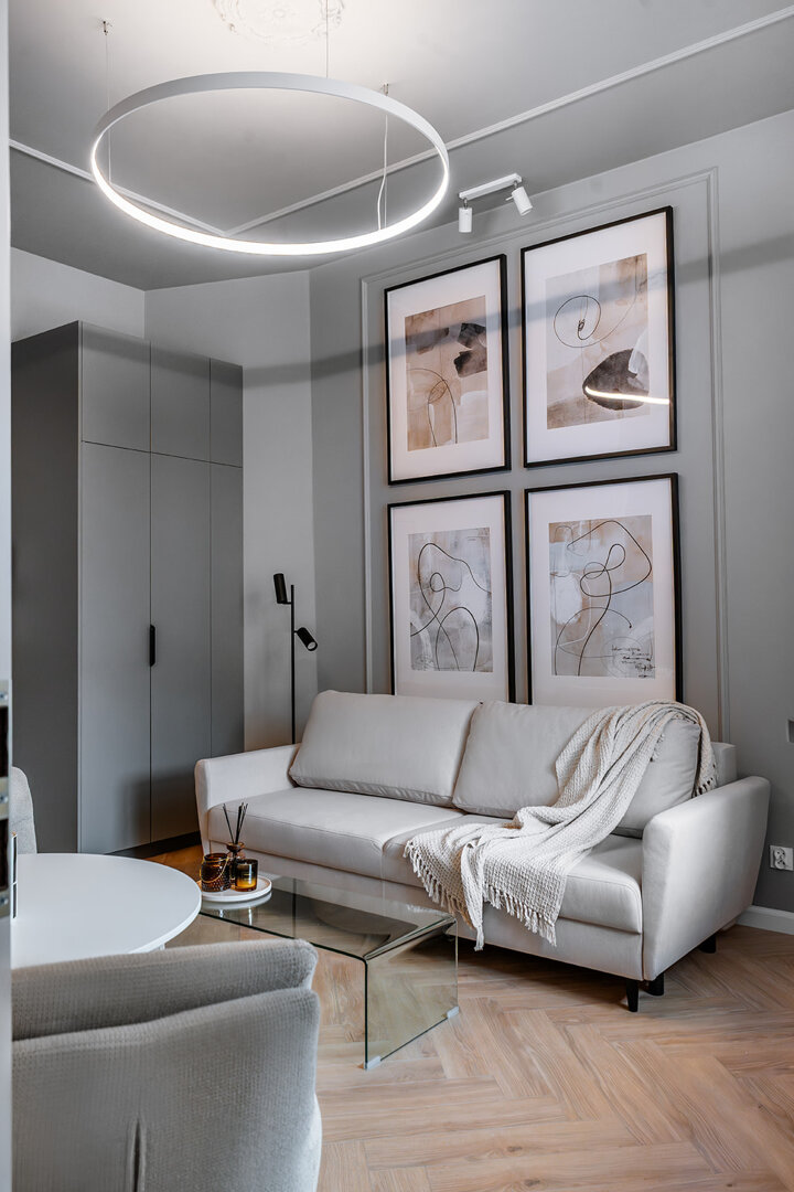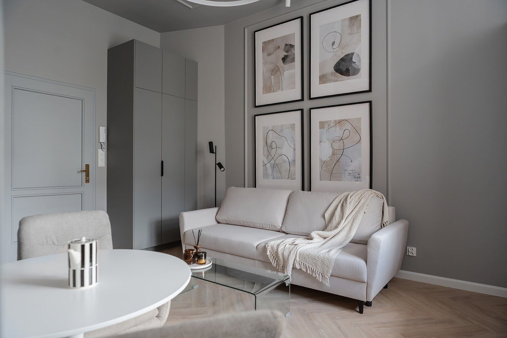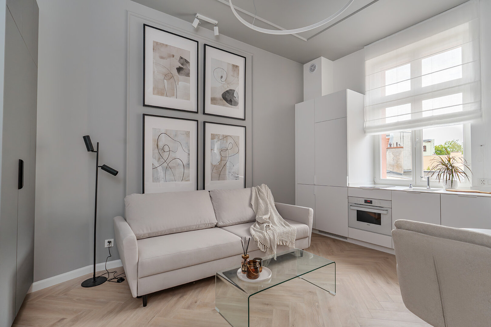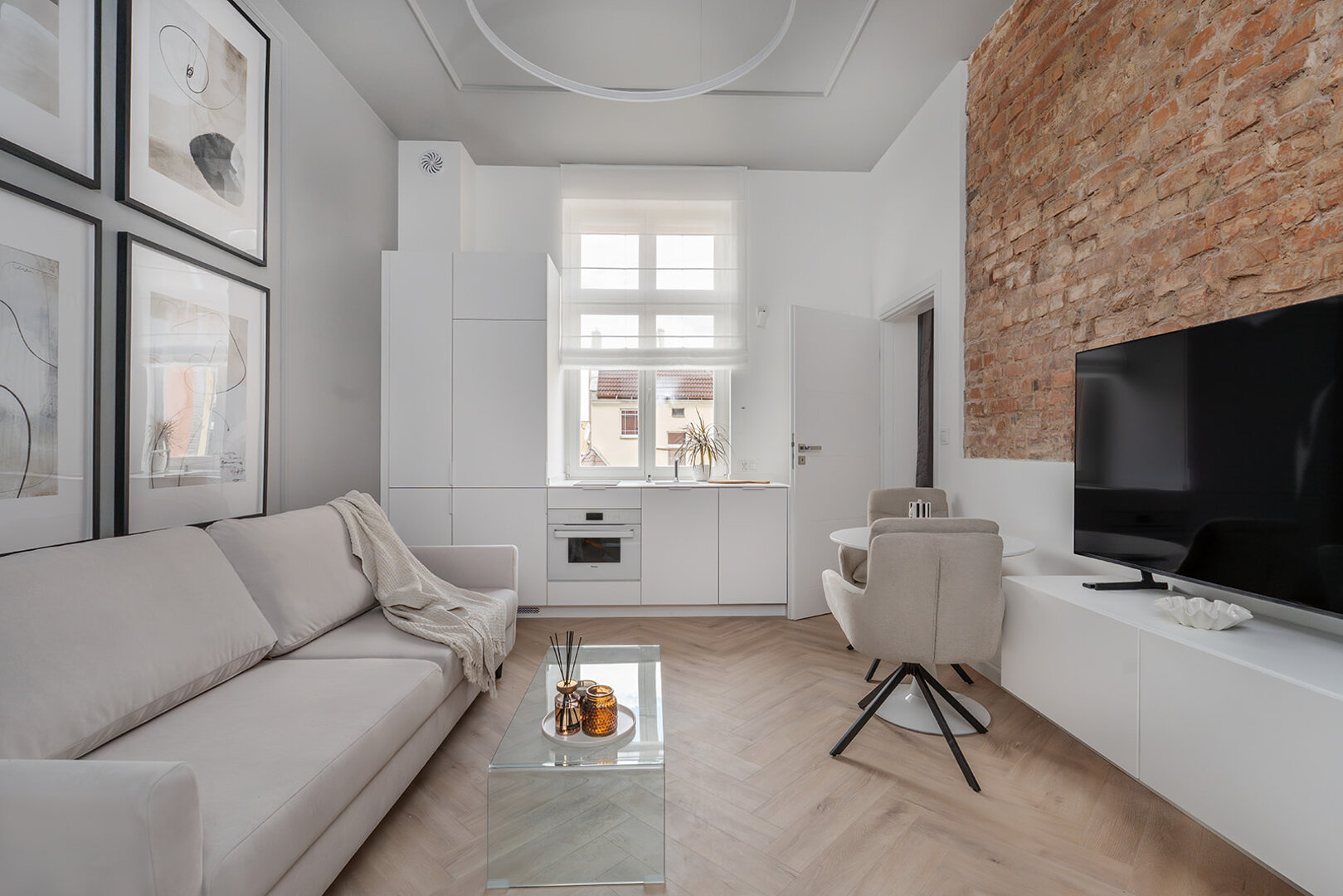 The interior has been decorated in a bright, consistent style that promotes relaxation and a sense of space. The living room with a kitchenette is the perfect place to spend time together, and the cozy bedroom ensures privacy and a good night's sleep. The whole creates a harmonious, urban space where it is easy to feel at ease and comfortable.