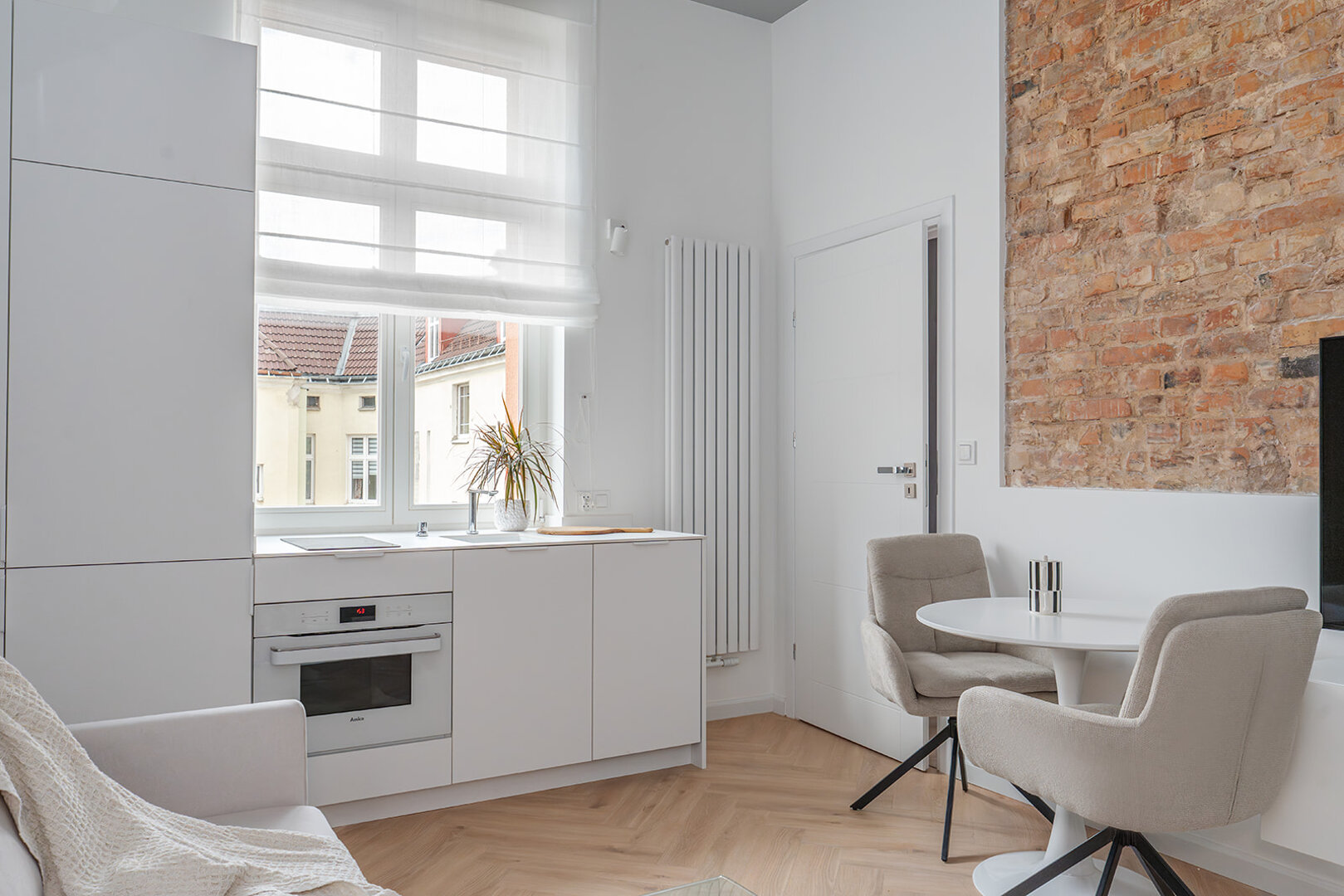 A cosy flat in Poznań's Jeżyce district, ideal for a couple, in the centre of the city's fashionable and vibrant district. The interior is decorated in a modern style with attention to detail, preserving the original elements of the century-old buildi