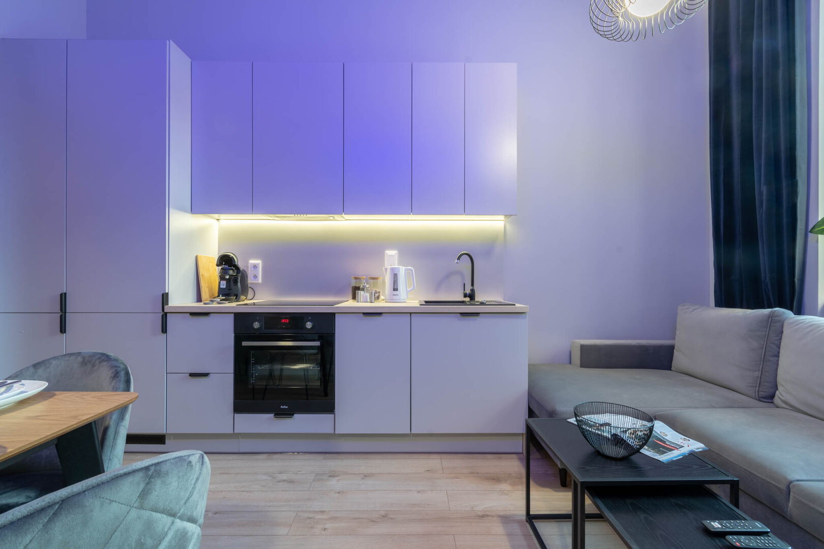 W salonie z otwartą kuchnią znajduje się wygodna rozkładana kanapa, idealna na relaks po dniu pełnym atrakcji. Dodatkowo, apartament oferuje rzutnik, dzięki któremu można zorganizować wieczory filmowe na dużym ekranie. W salonie nie brakuje także unikalnego muralu, który dodaje artystycznego charakteru całemu mieszkaniu.