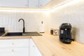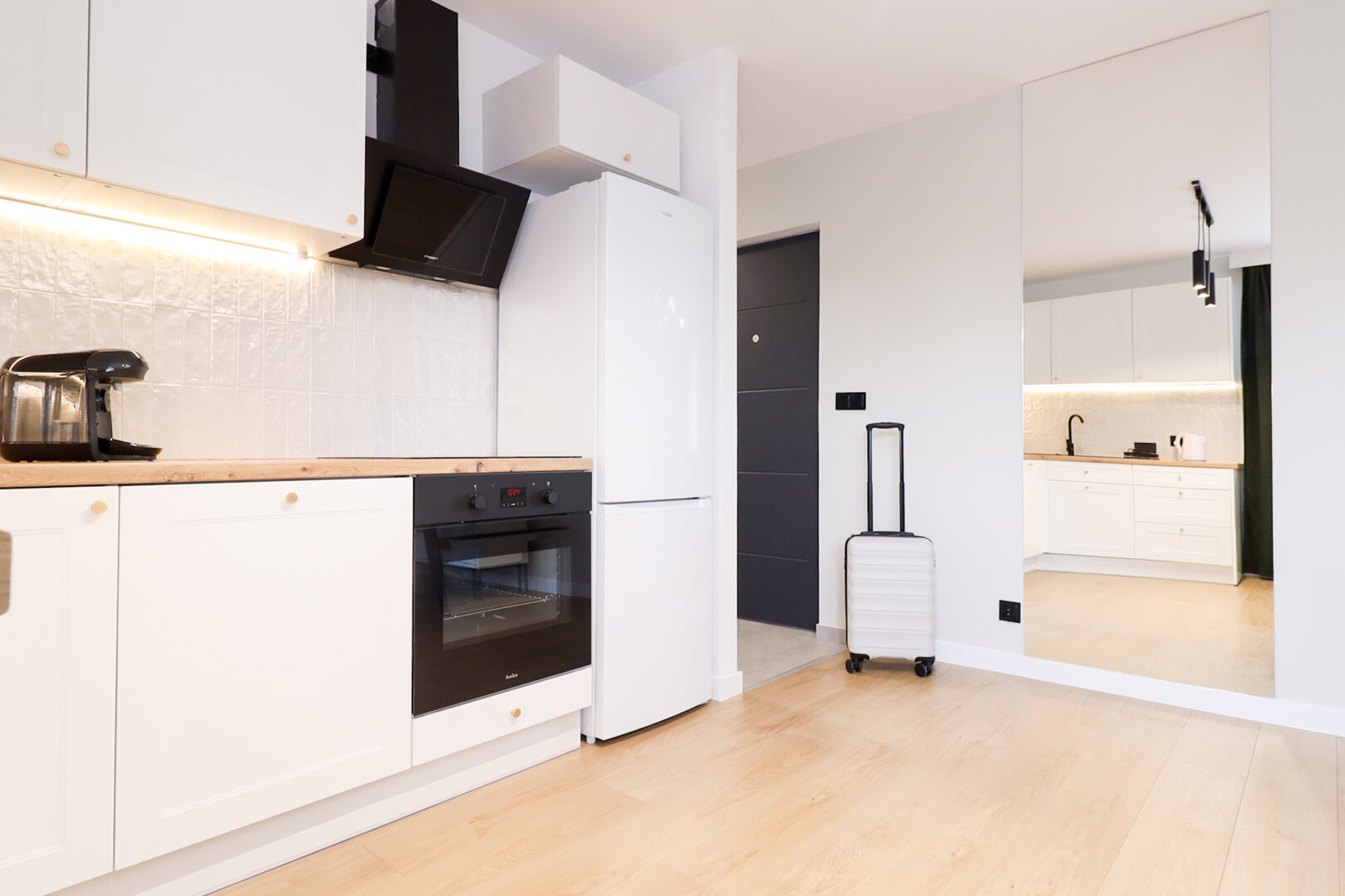 Aneks kuchenny jest w pełni wyposażony – do dyspozycji gości jest piekarnik, mikrofalówka, zmywarka i wszystkie niezbędne akcesoria, więc bez problemu można przygotować posiłek. W apartamencie znajduje się również pralka, telewizor oraz szybkie Wi-Fi.